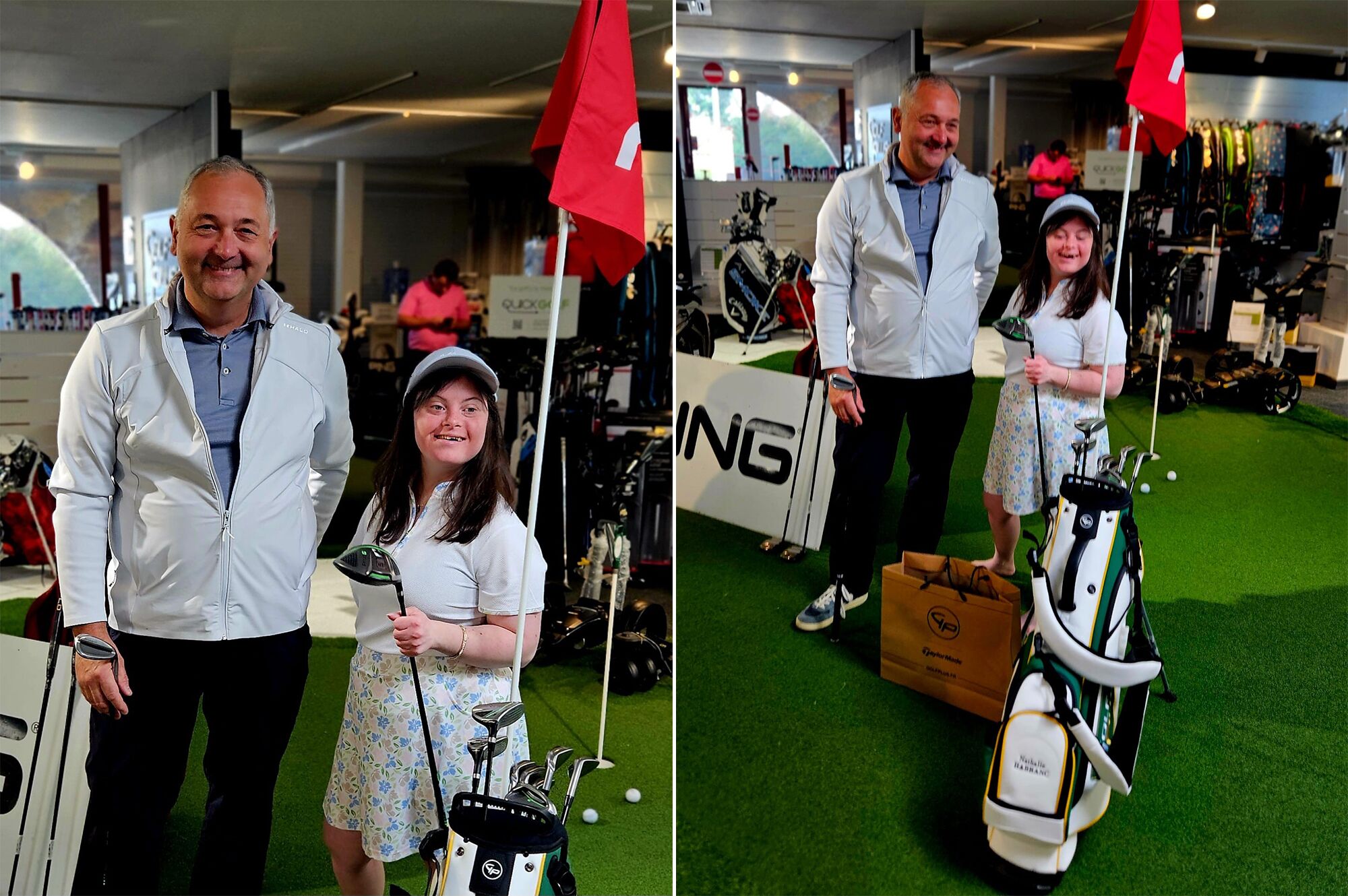 Dans ce parcours inspirant, Golf Plus Waterloo a choisi de s’engager aux côtés de Nathalie. Dans un premier temps, et en collaboration avec ses partenaires, le club lui a fourni du matériel adapté ainsi qu’un sac logoté GP — un geste concret qui amorce une relation de confiance avec Nathalie et son association.